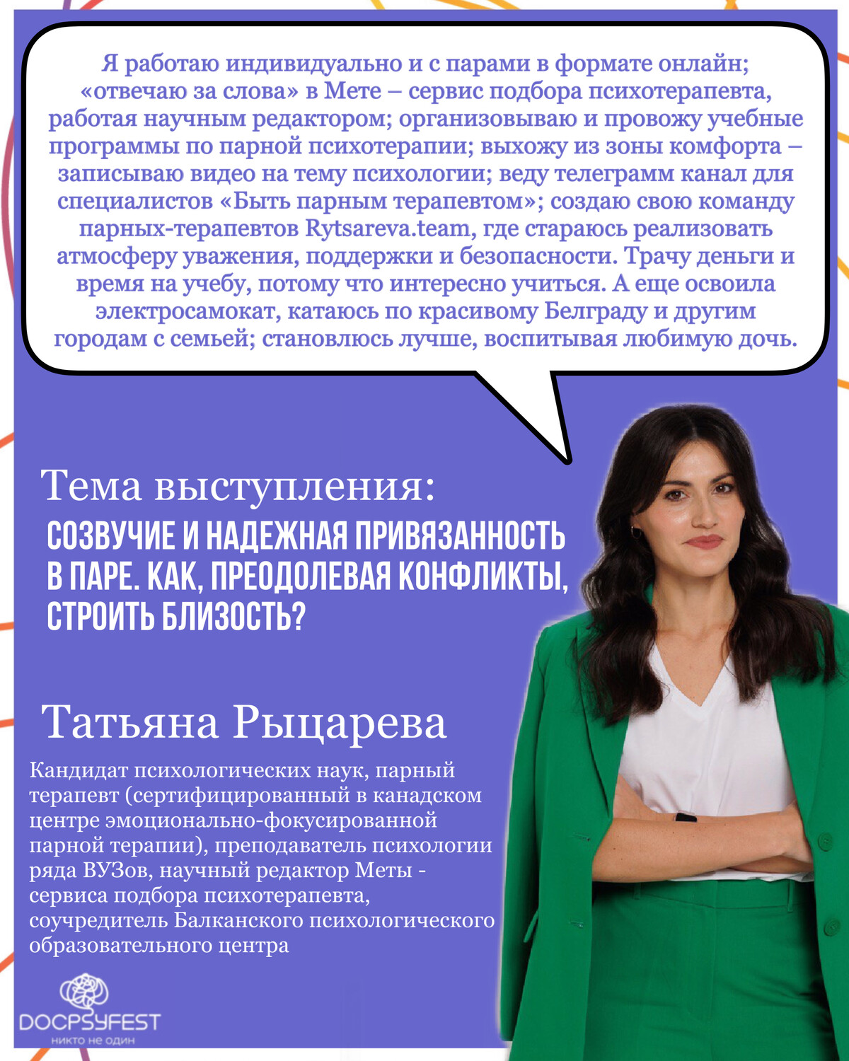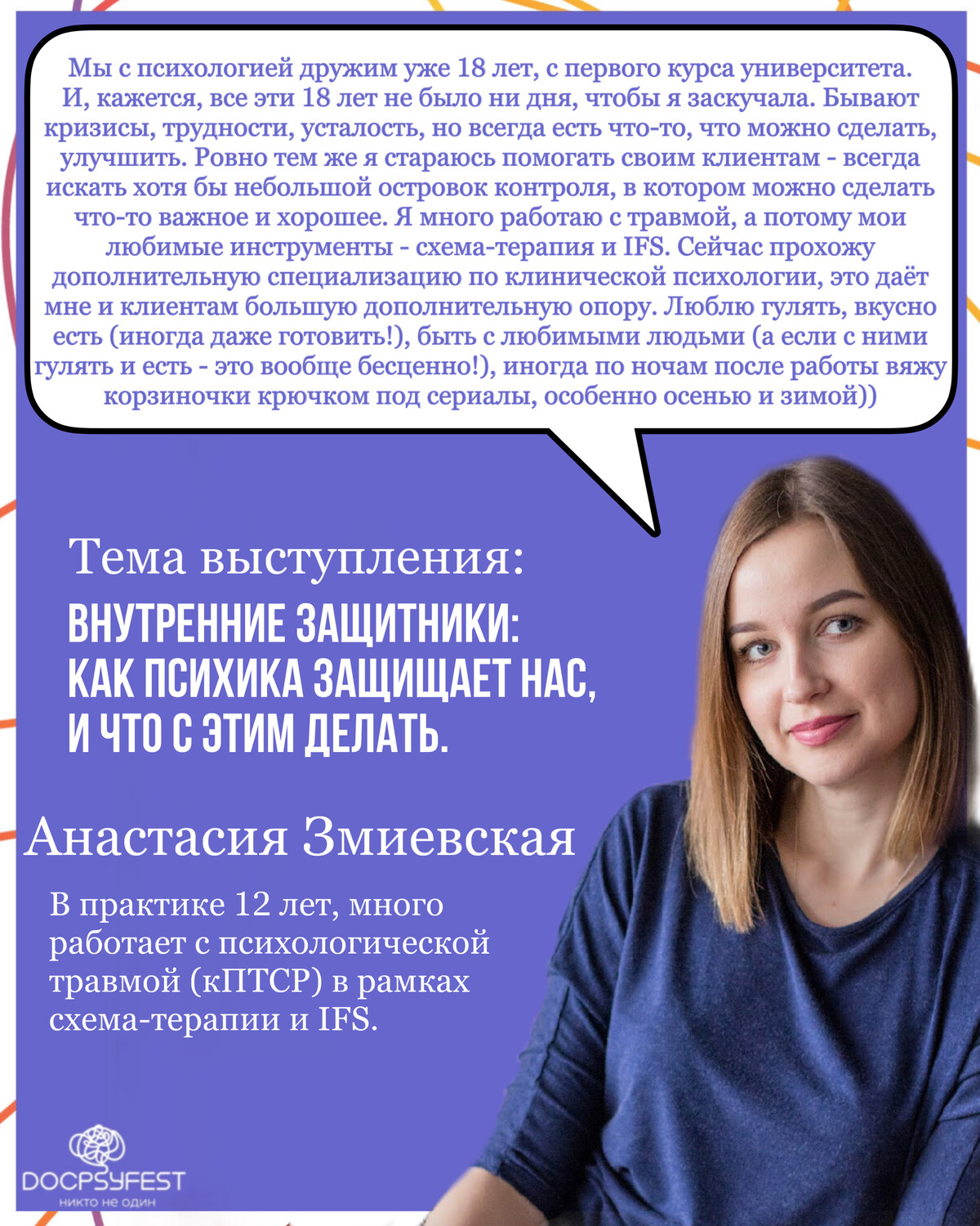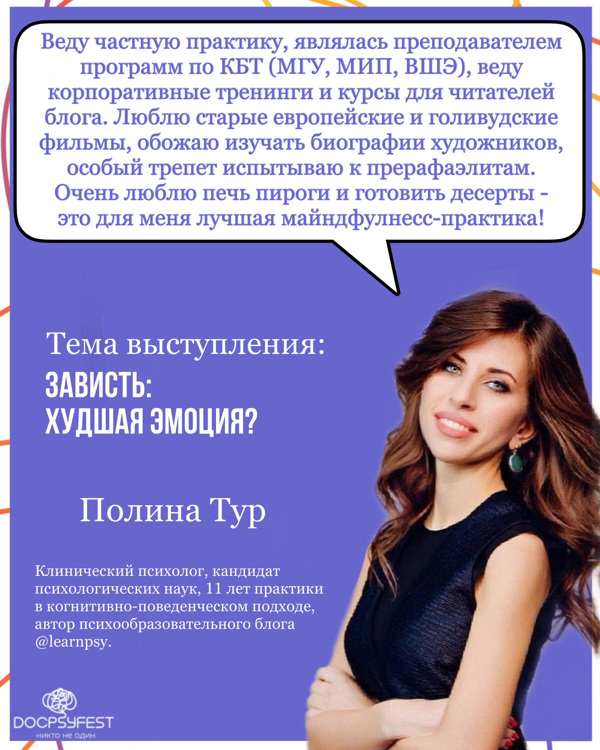 Анастасия Змиевская Тема: Внутренние Защитники: как психика защищает нас, и что с этим делать. | Татьяна Рыцарева Тема: Созвучие и надежная привязанность в паре. Как, преодолевая конфликты, строить близость? | Настасья Соломина Тема: Внутренние критики: прогнать нельзя любить | Полина Тур Тема: Зависть: худшая эмоция? |