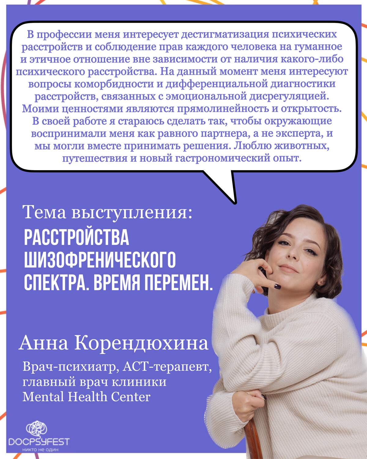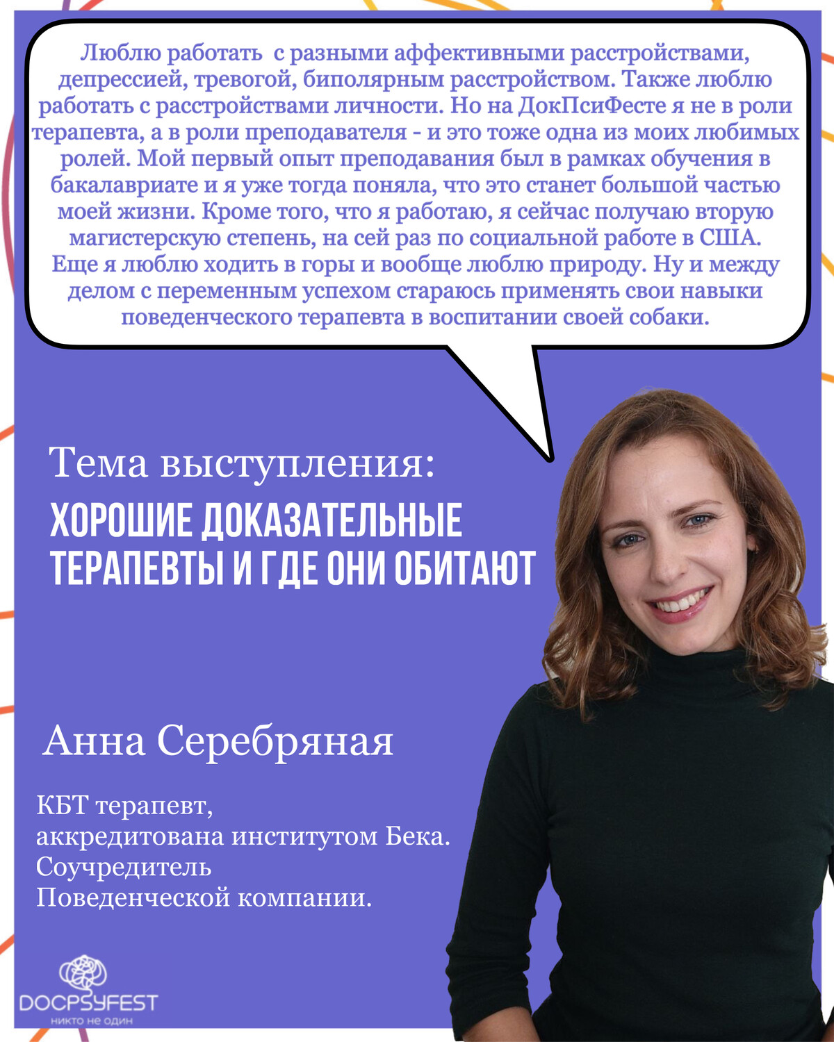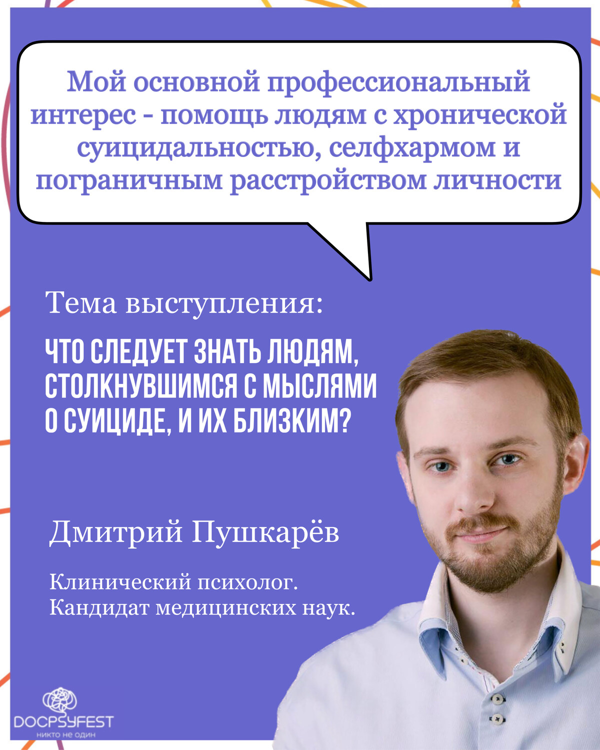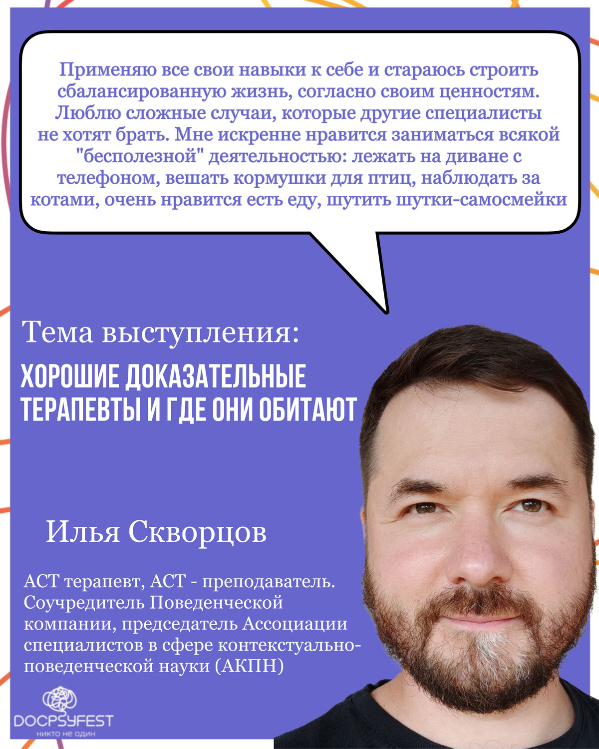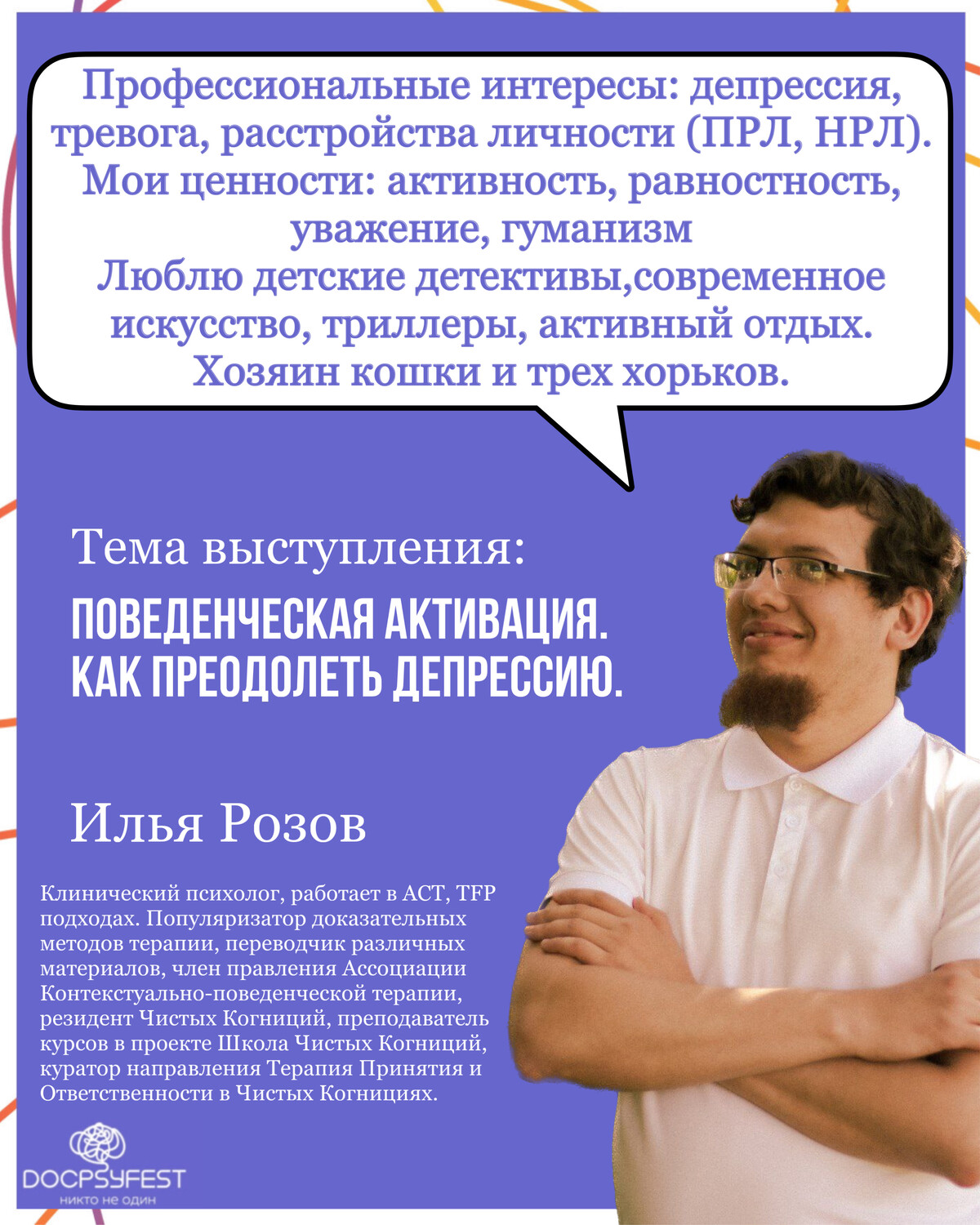 | 19 ноября (вскр) | Илья Розов, Лена Алоец Тема: Поведенческая Активация. Как преодолеть депрессию. | Татьяна Журавлева Тема: Как поддержать себя в протоколе ЭКО | Анна Корендюхина Тема: Расстройства шизофренического спектра. Время перемен. | Наталья Кисельникова Тема: Межкультурная коммуникация: учитывая различия | Дмитрий Пушкарёв Тема: Что следует знать людям, столкнувшимся с мыслями о суициде, и их близким? | Анна Серебряная, Илья Скворцов, Вадим Матюшин Тема: Хорошие доказательные терапевты и где они обитают |