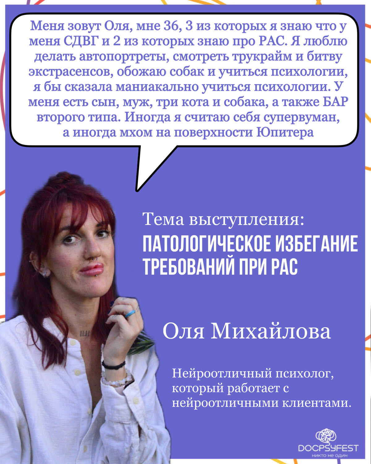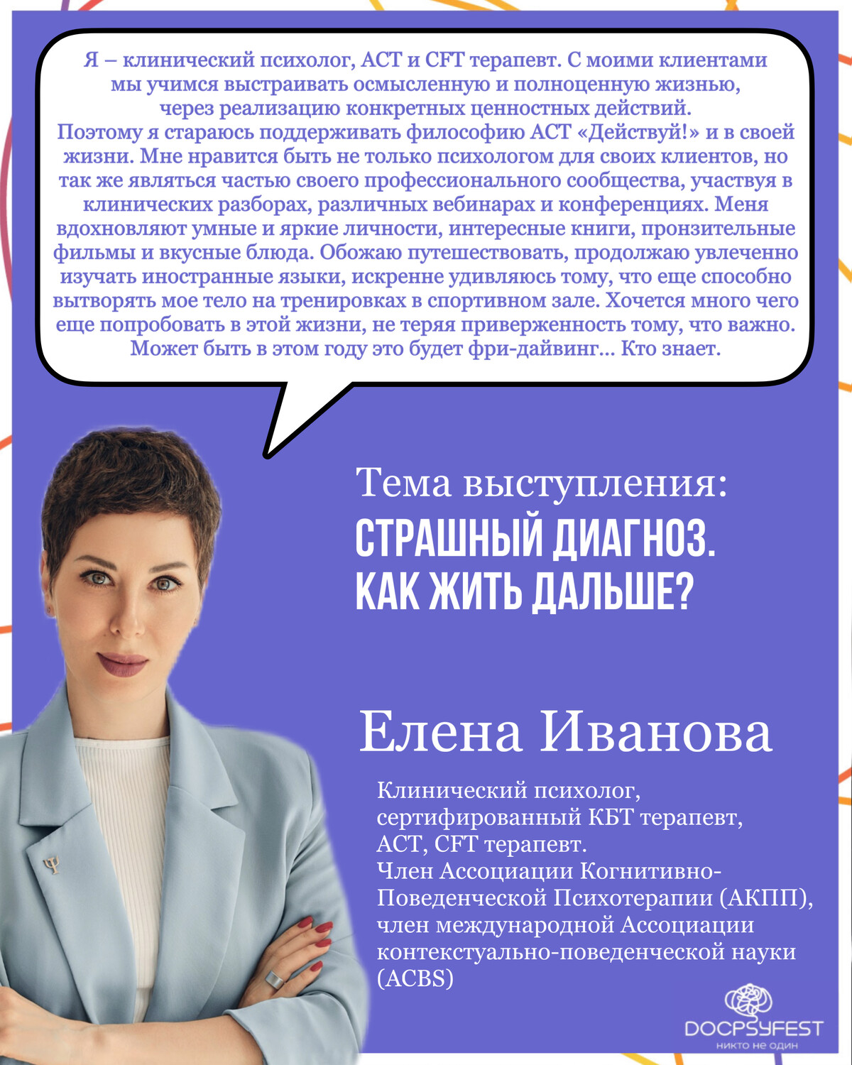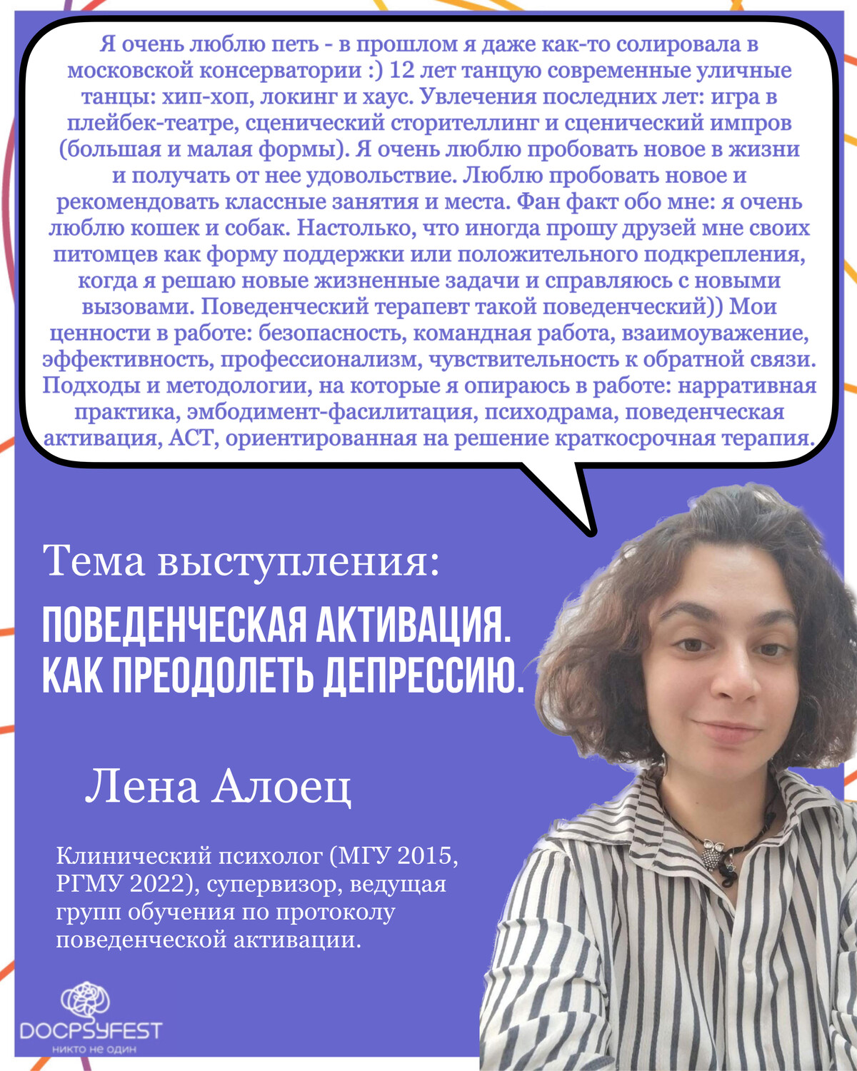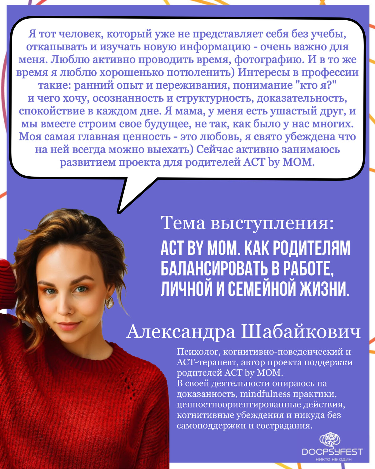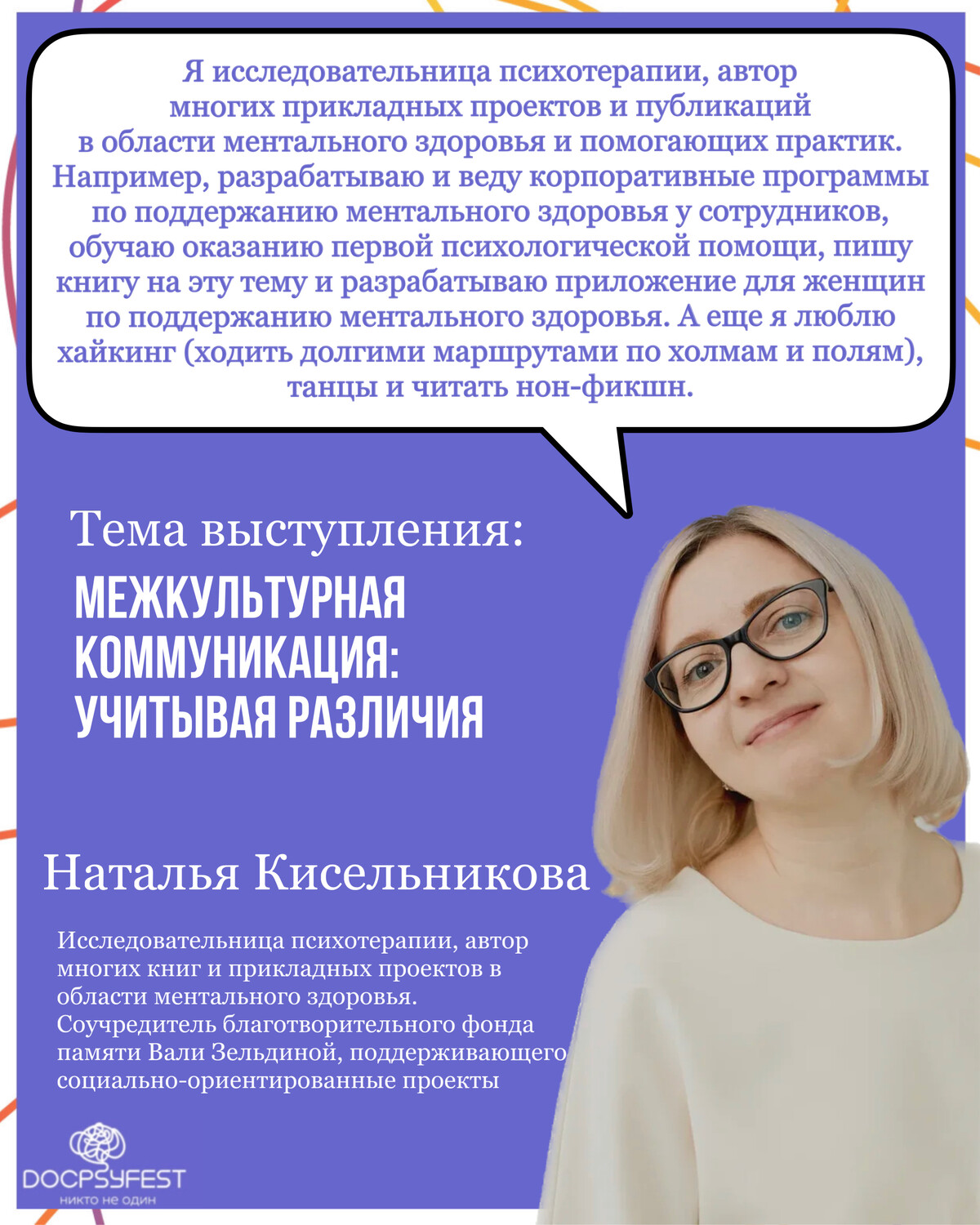 | 19 ноября (вскр) | Илья Розов, Лена Алоец Тема: Поведенческая Активация. Как преодолеть депрессию. | Татьяна Журавлева Тема: Как поддержать себя в протоколе ЭКО | Анна Корендюхина Тема: Расстройства шизофренического спектра. Время перемен. | Наталья Кисельникова Тема: Межкультурная коммуникация: учитывая различия | Дмитрий Пушкарёв Тема: Что следует знать людям, столкнувшимся с мыслями о суициде, и их близким? | Анна Серебряная, Илья Скворцов, Вадим Матюшин Тема: Хорошие доказательные терапевты и где они обитают |