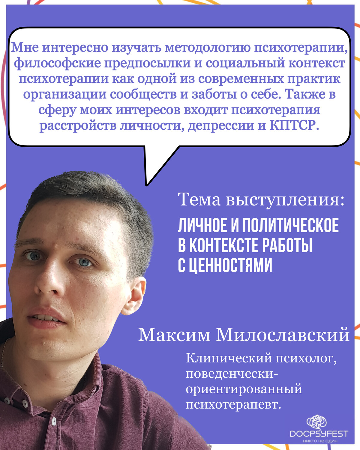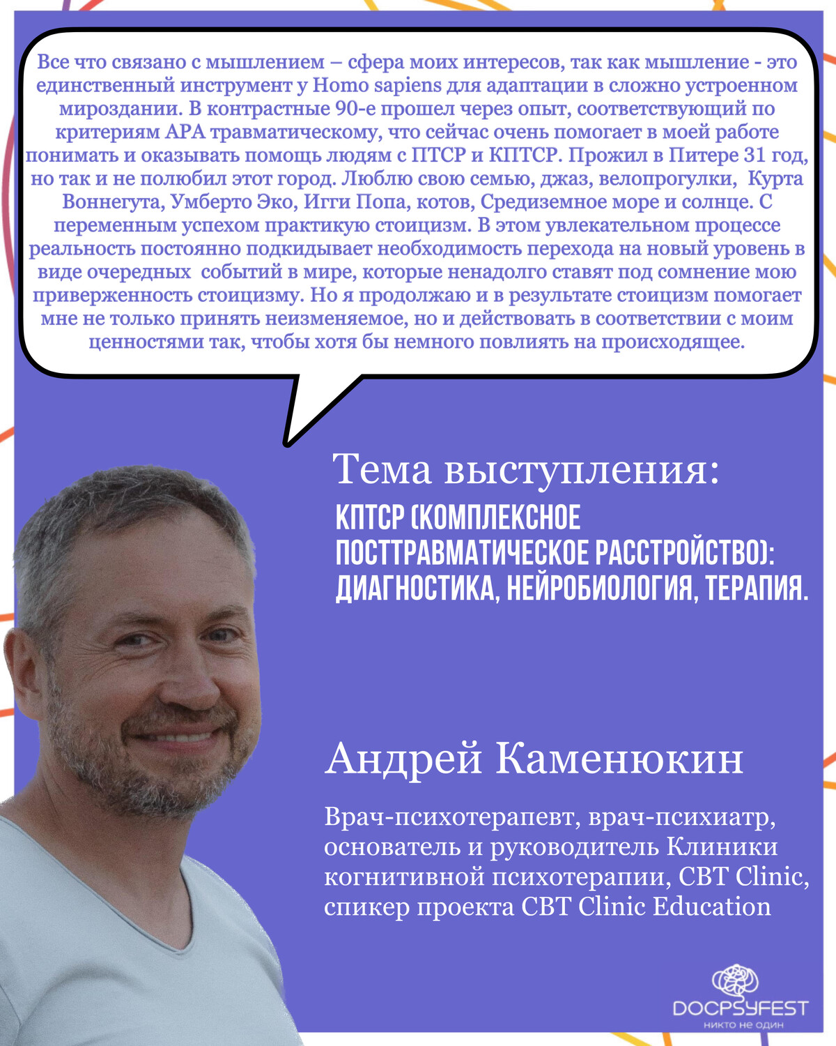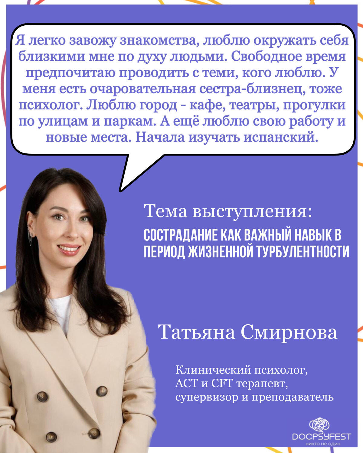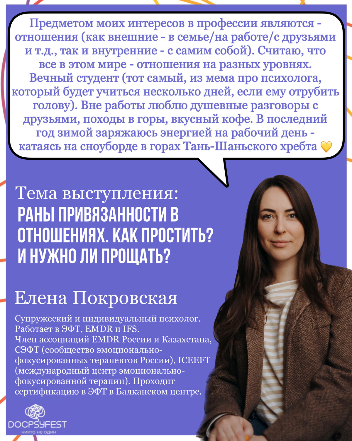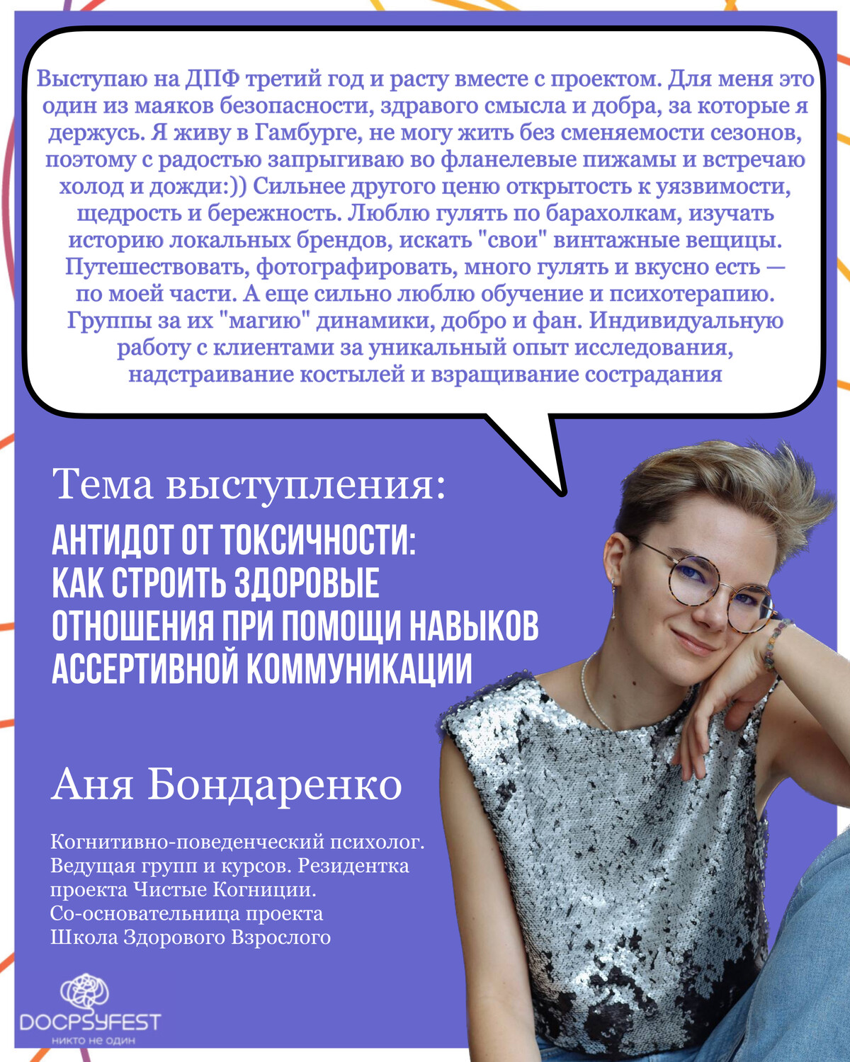 | 17 ноября (пт) | Елена Покровская Тема: Раны привязанности в отношениях. Как простить? И нужно ли прощать? | Екатерина Зиброва Тема: Искоренить в себе империю: что нам дает оптика деколониальности в психологии? | Андрей Каменюкин Тема: КПТСР (комплексное посттравматическое расстройство): диагностика, нейробиология, терапия. | Мария Щевлягина Тема: Как справиться с бессонницей - инструменты КПТ для хорошего сна | Екатерина Онокой, Дарья Мишанина Тема: Никто не один: возможности групповой терапии | Аня Бондаренко Тема: Антидот от токсичности: как строить здоровые отношения при помощи навыков ассертивной коммуникации |
