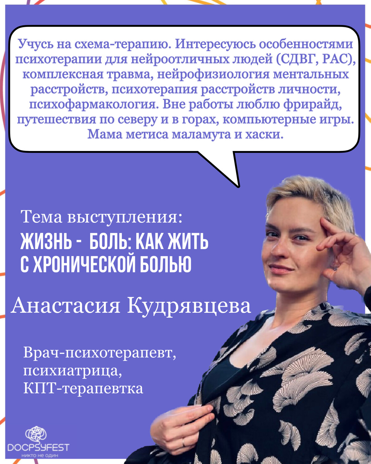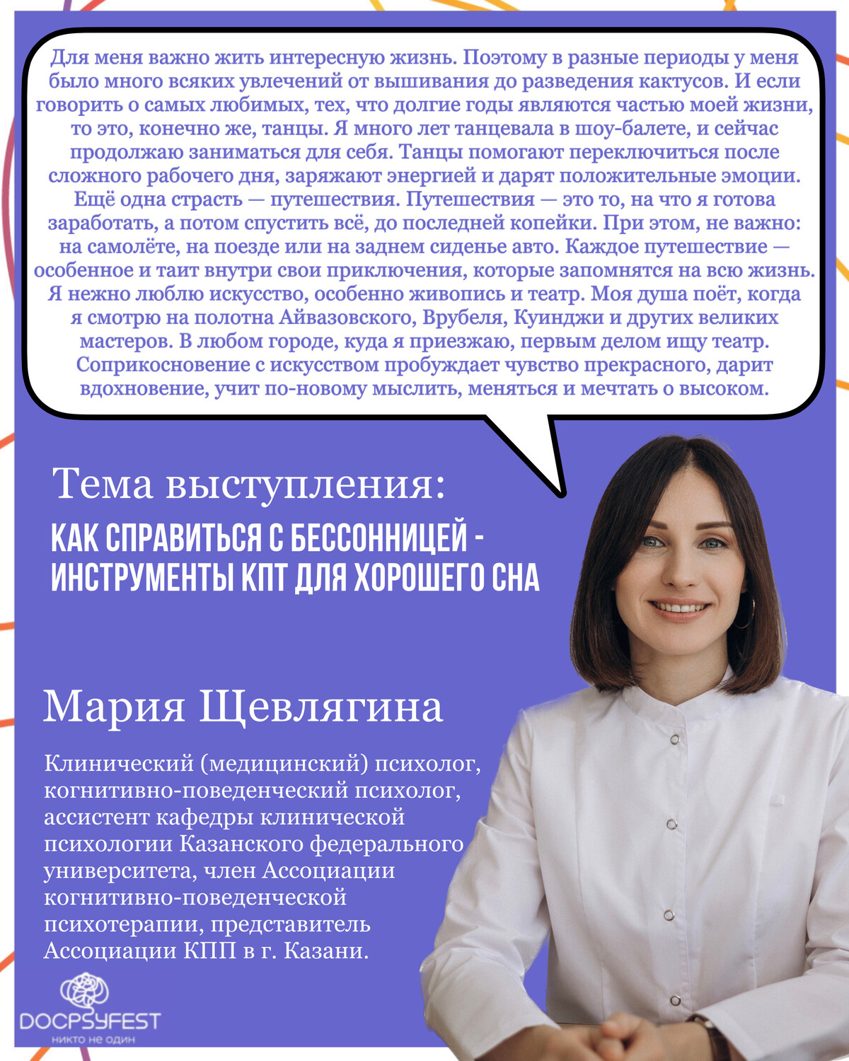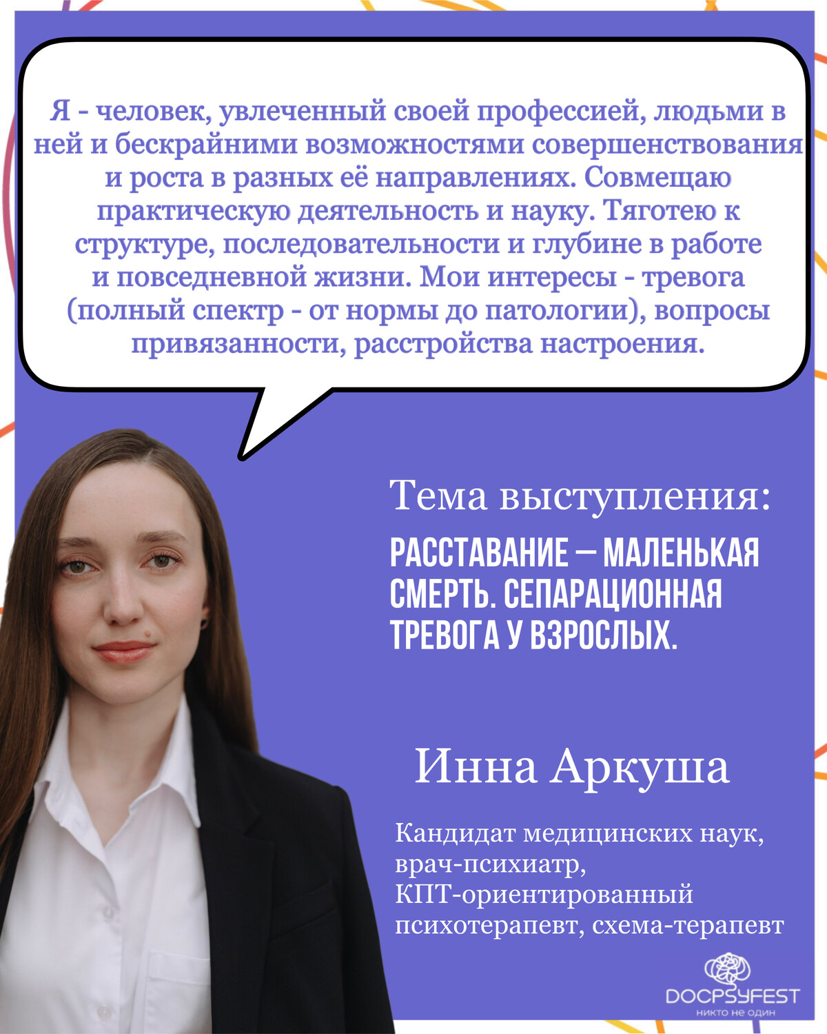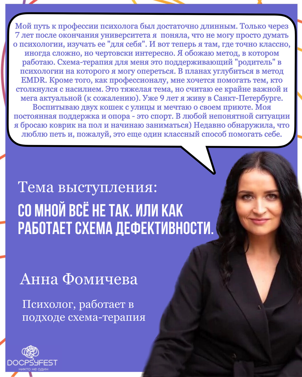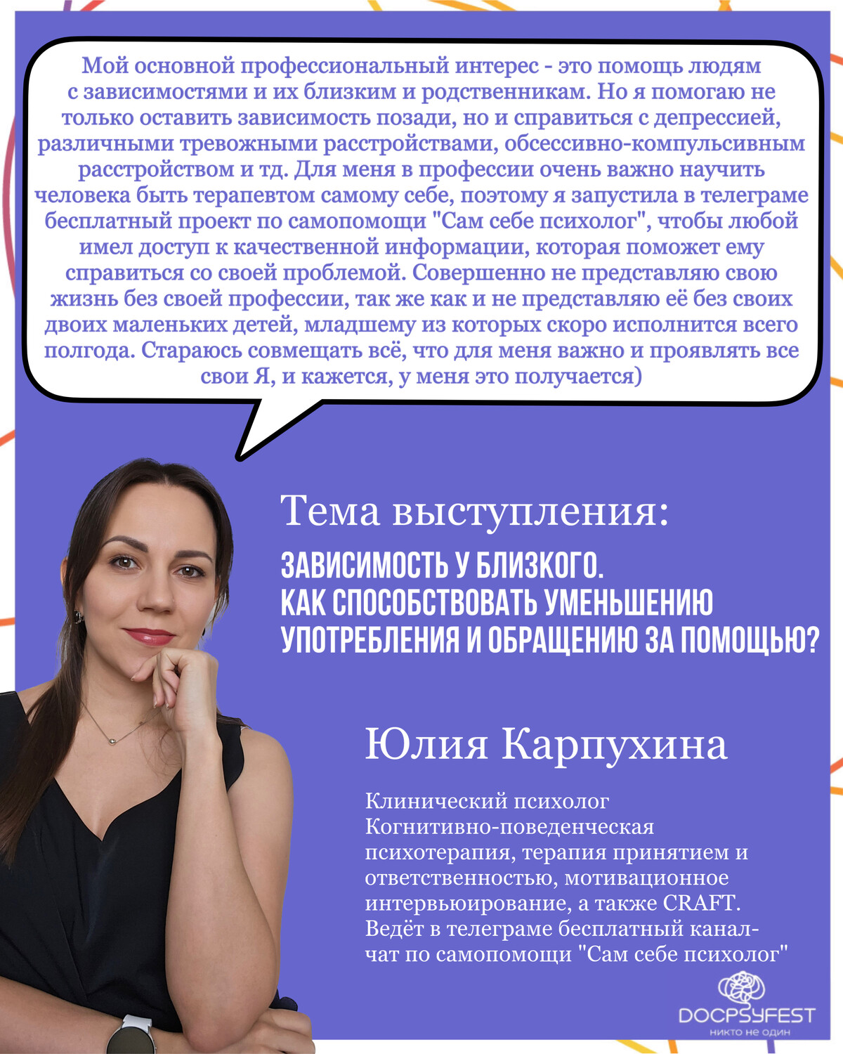 | 17 ноября (пт) | Елена Покровская Тема: Раны привязанности в отношениях. Как простить? И нужно ли прощать? | Екатерина Зиброва Тема: Искоренить в себе империю: что нам дает оптика деколониальности в психологии? | Андрей Каменюкин Тема: КПТСР (комплексное посттравматическое расстройство): диагностика, нейробиология, терапия. | Мария Щевлягина Тема: Как справиться с бессонницей - инструменты КПТ для хорошего сна | Екатерина Онокой, Дарья Мишанина Тема: Никто не один: возможности групповой терапии | Аня Бондаренко Тема: Антидот от токсичности: как строить здоровые отношения при помощи навыков ассертивной коммуникации |