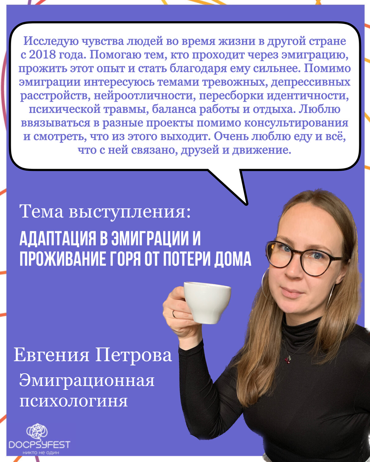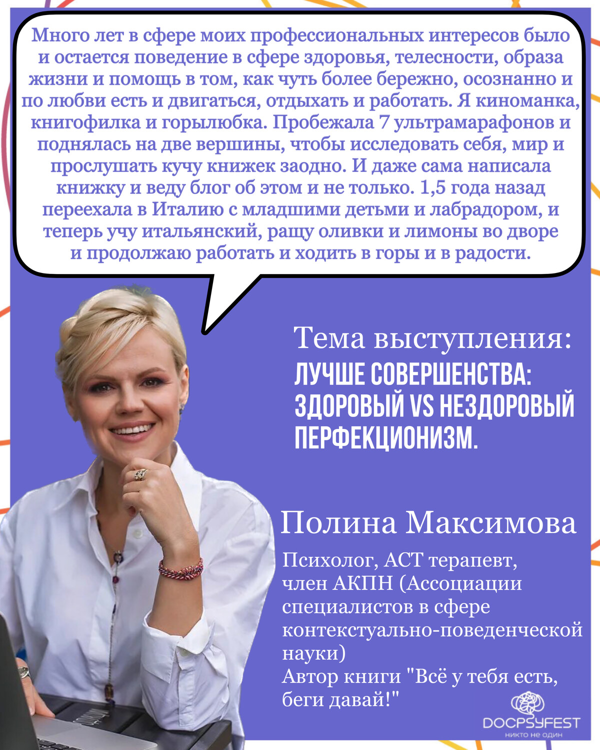 | 16 ноября (чт) | Евгения Петрова Тема: Адаптация в эмиграции и проживание горя от потери дома | Полина Максимова Тема: Лучше совершенства: здоровый VS нездоровый перфекционизм. | Екатерина Судакова, Светлана Лысенко Тема: Что такое психологическая гибкость и как она может помочь подростку стать сильнее | Елизавета Федорова Тема: Психотерапия БАР: хватит говорить, пора делать | Максим Милославский Тема: Личное и политическое в контексте работы с ценностями. | Александр Ярцев Тема: Как медитировать? |
