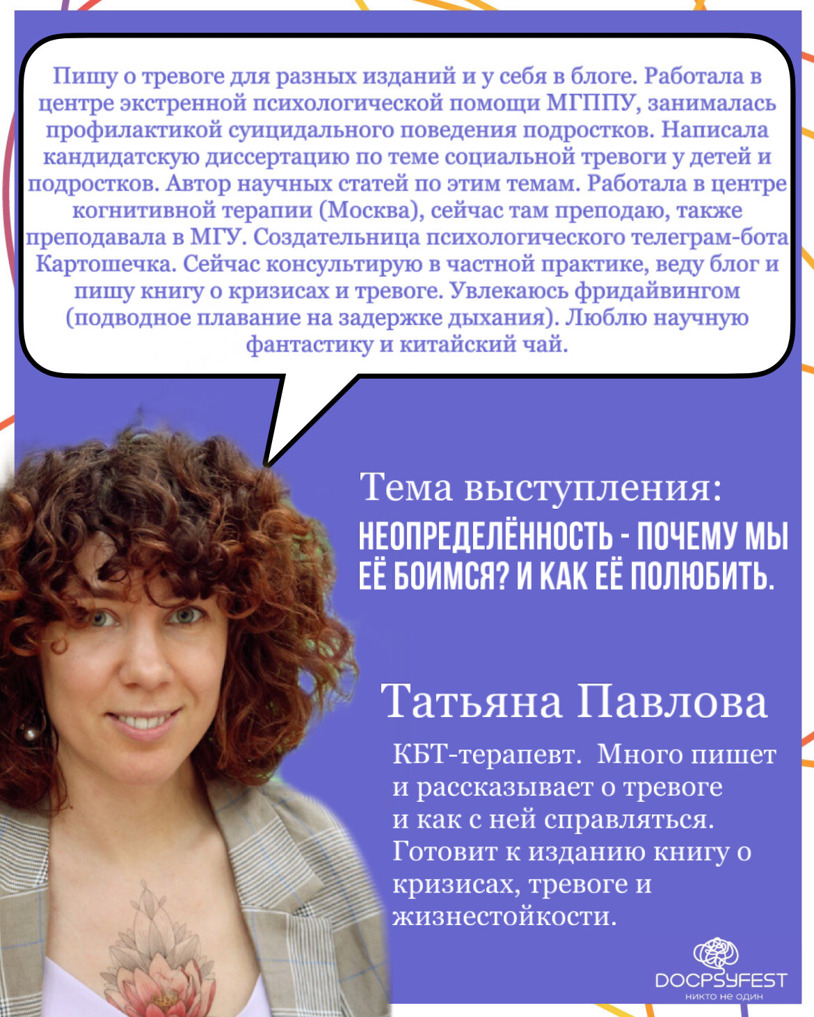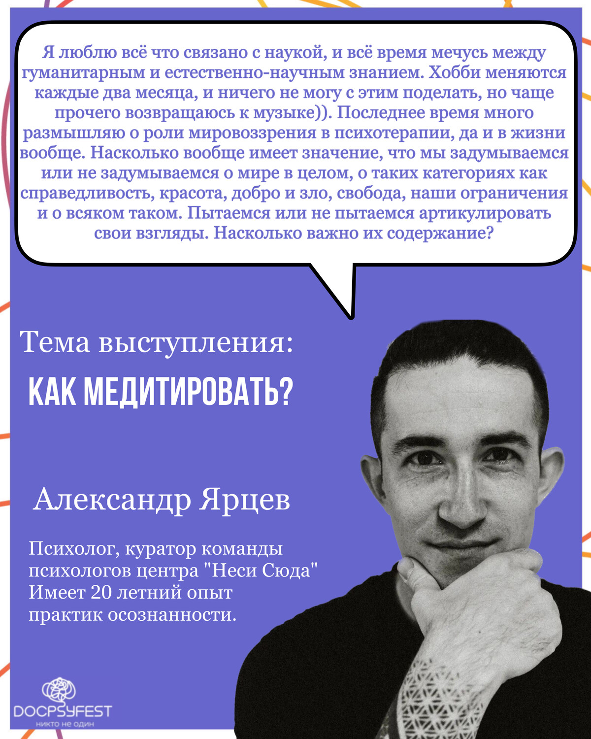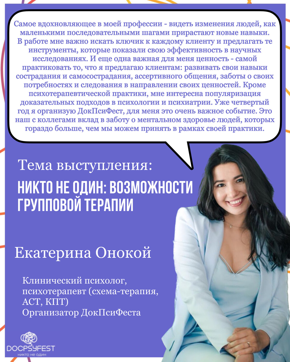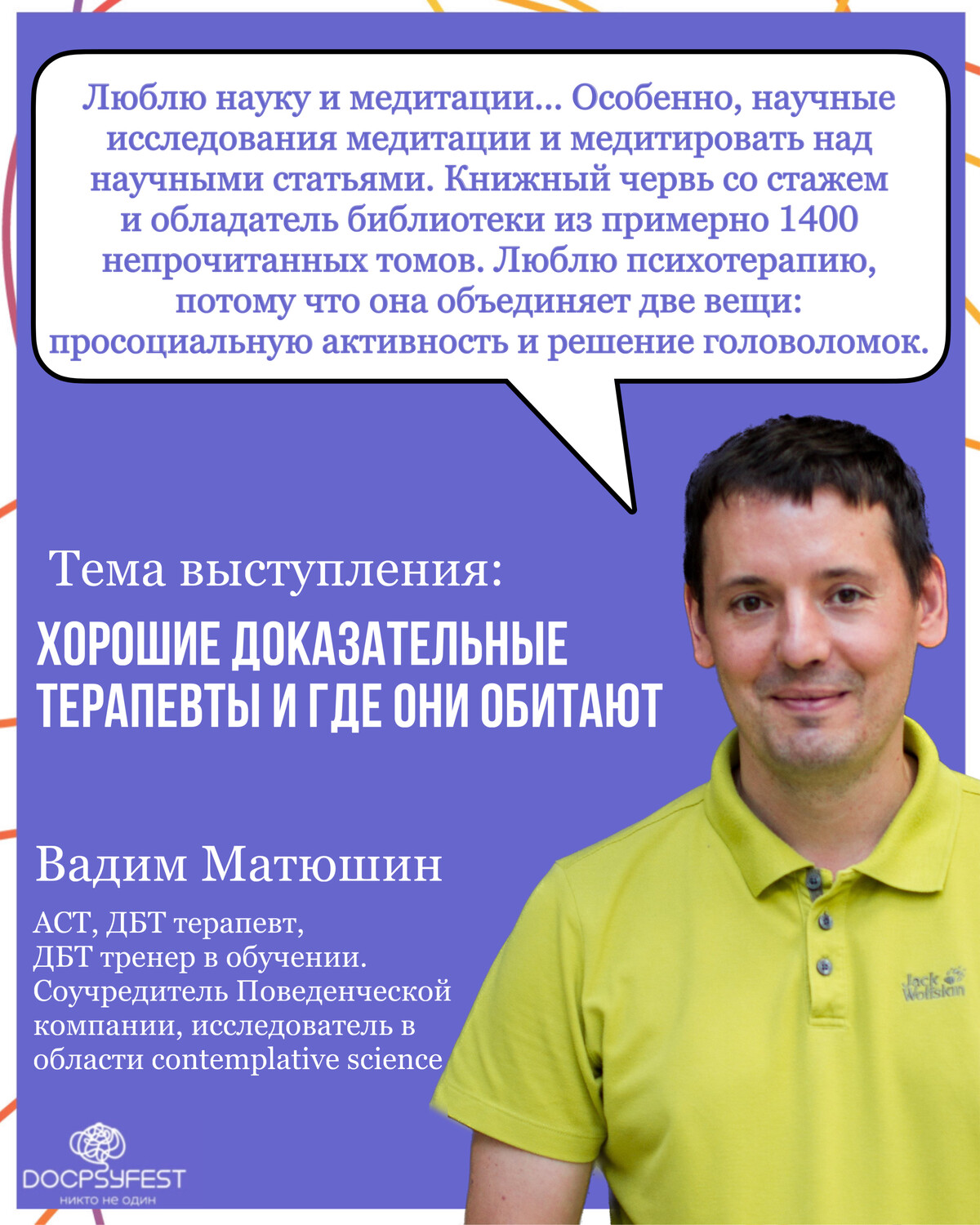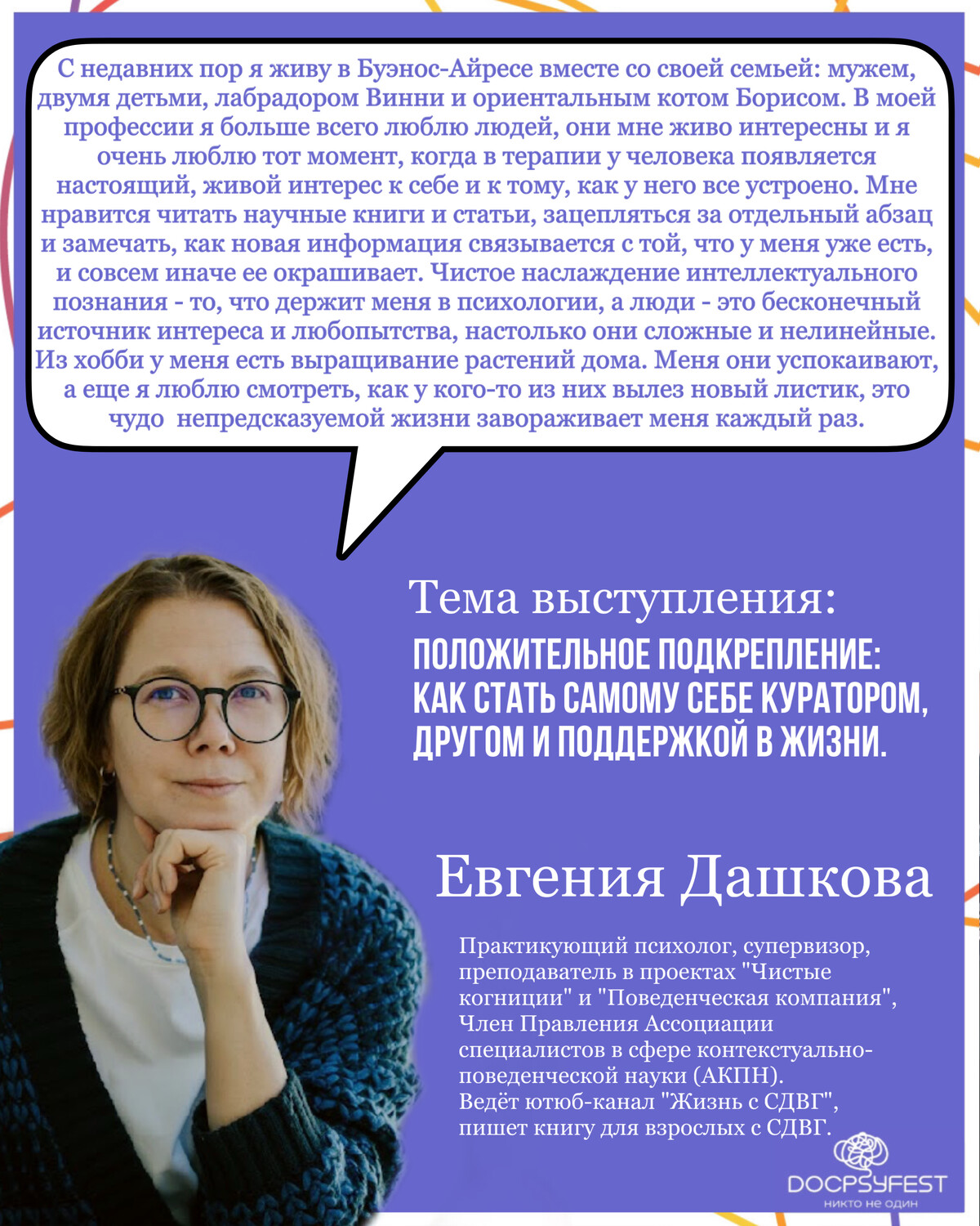 Выступления спикеров ДокПсиФеста - это научно-обоснованная информация о ментальном здоровье и практические инструменты, которые показали свою эффективность в научных исследованиях. Обоснованно, аргументированно и при этом доступно специалисты делятся тем, что может значительно улучшить жизни людей. И делают это абсолютно бесплатно