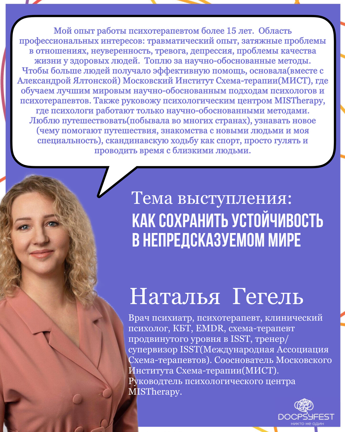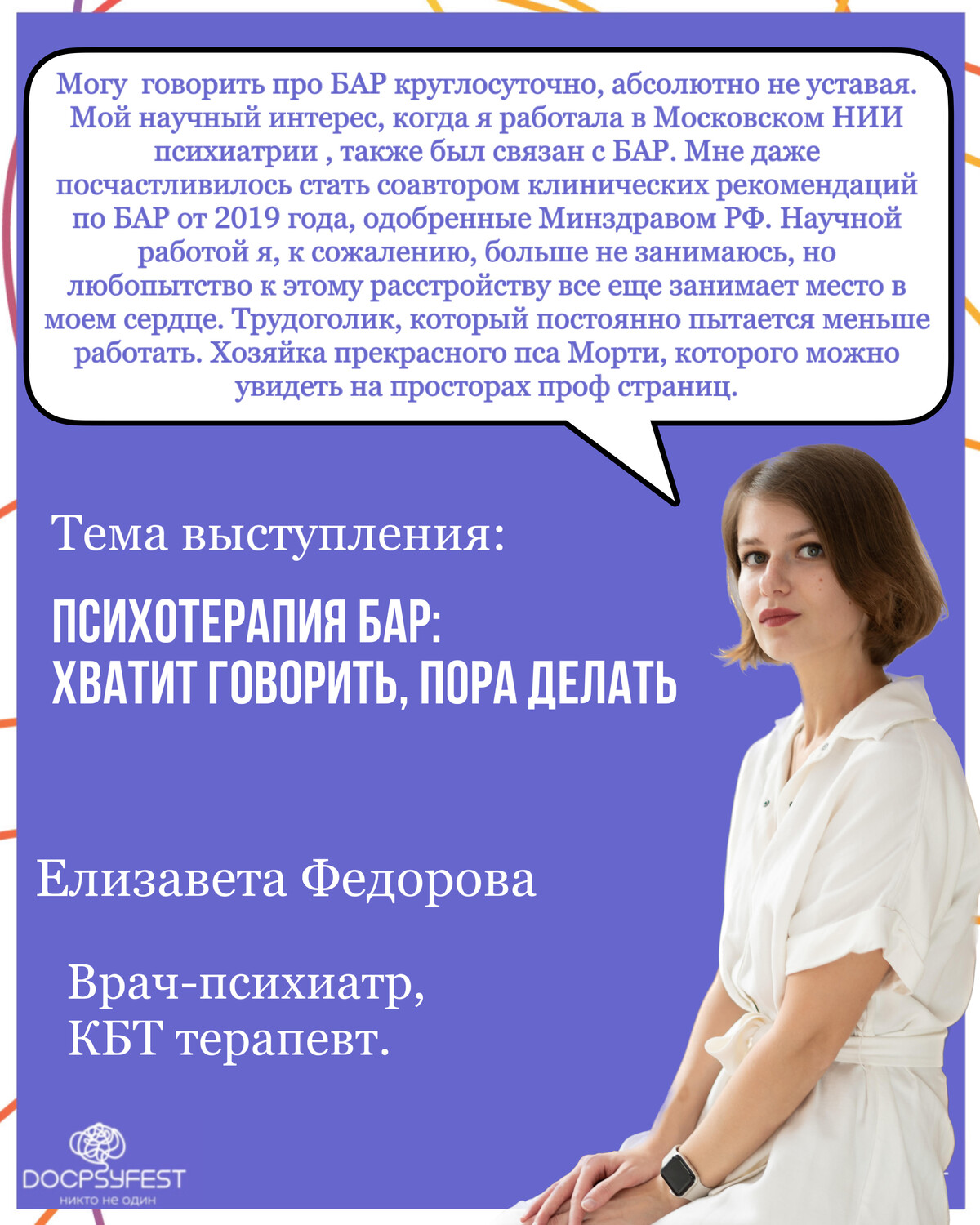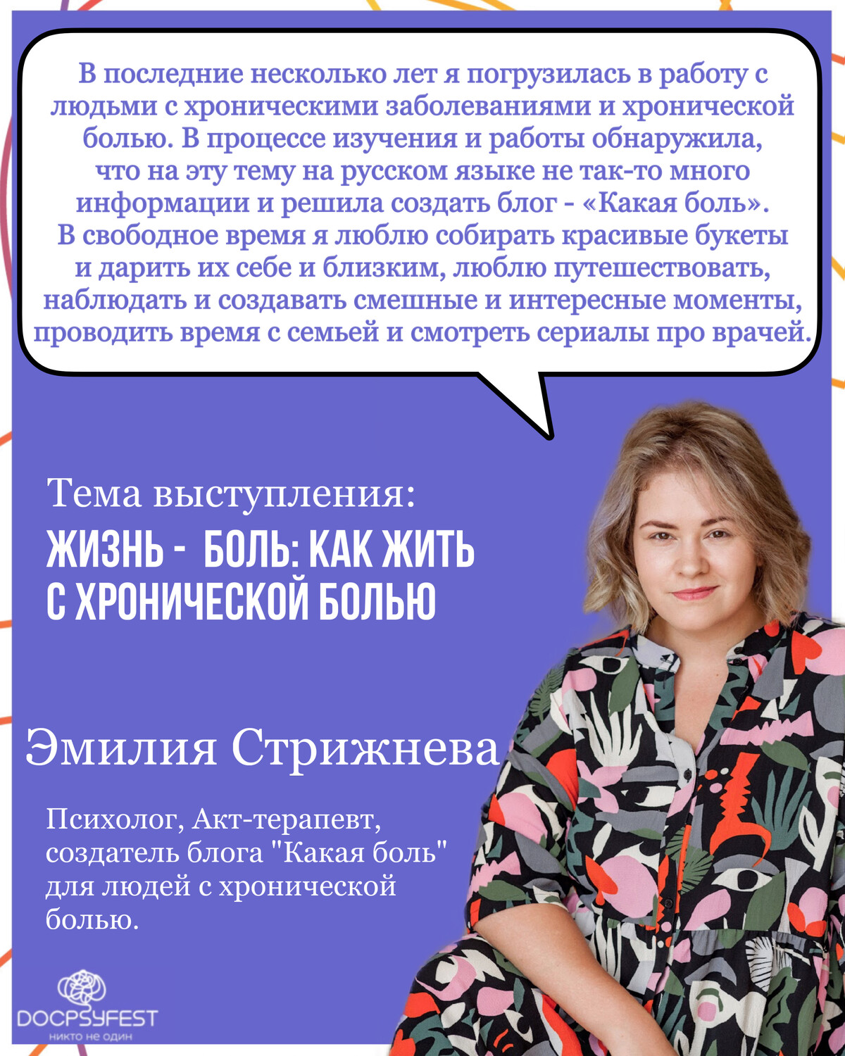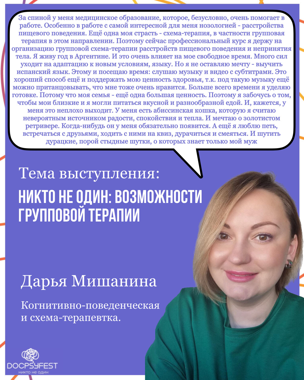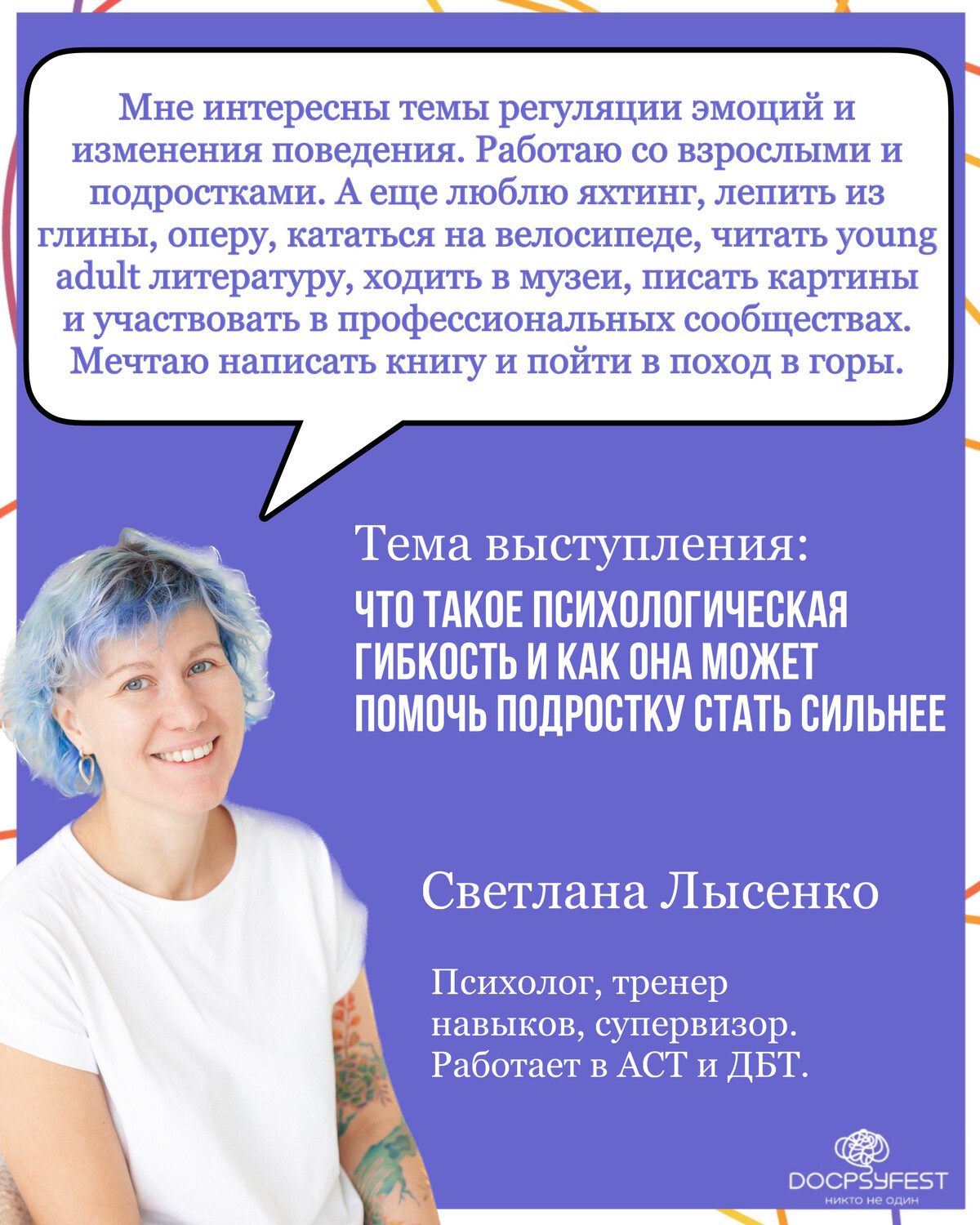 Выступления спикеров ДокПсиФеста - это научно-обоснованная информация о ментальном здоровье и практические инструменты, которые показали свою эффективность в научных исследованиях. Обоснованно, аргументированно и при этом доступно специалисты делятся тем, что может значительно улучшить жизни людей. И делают это абсолютно бесплатно