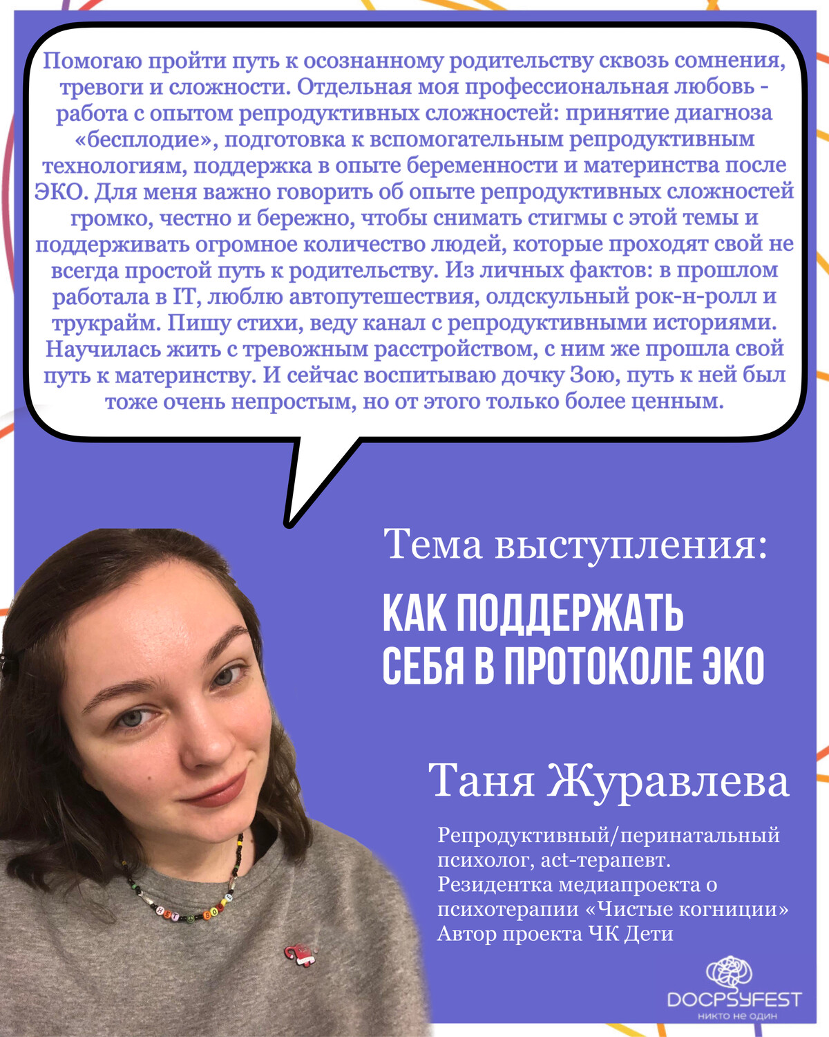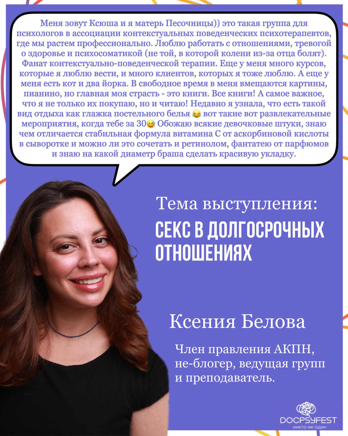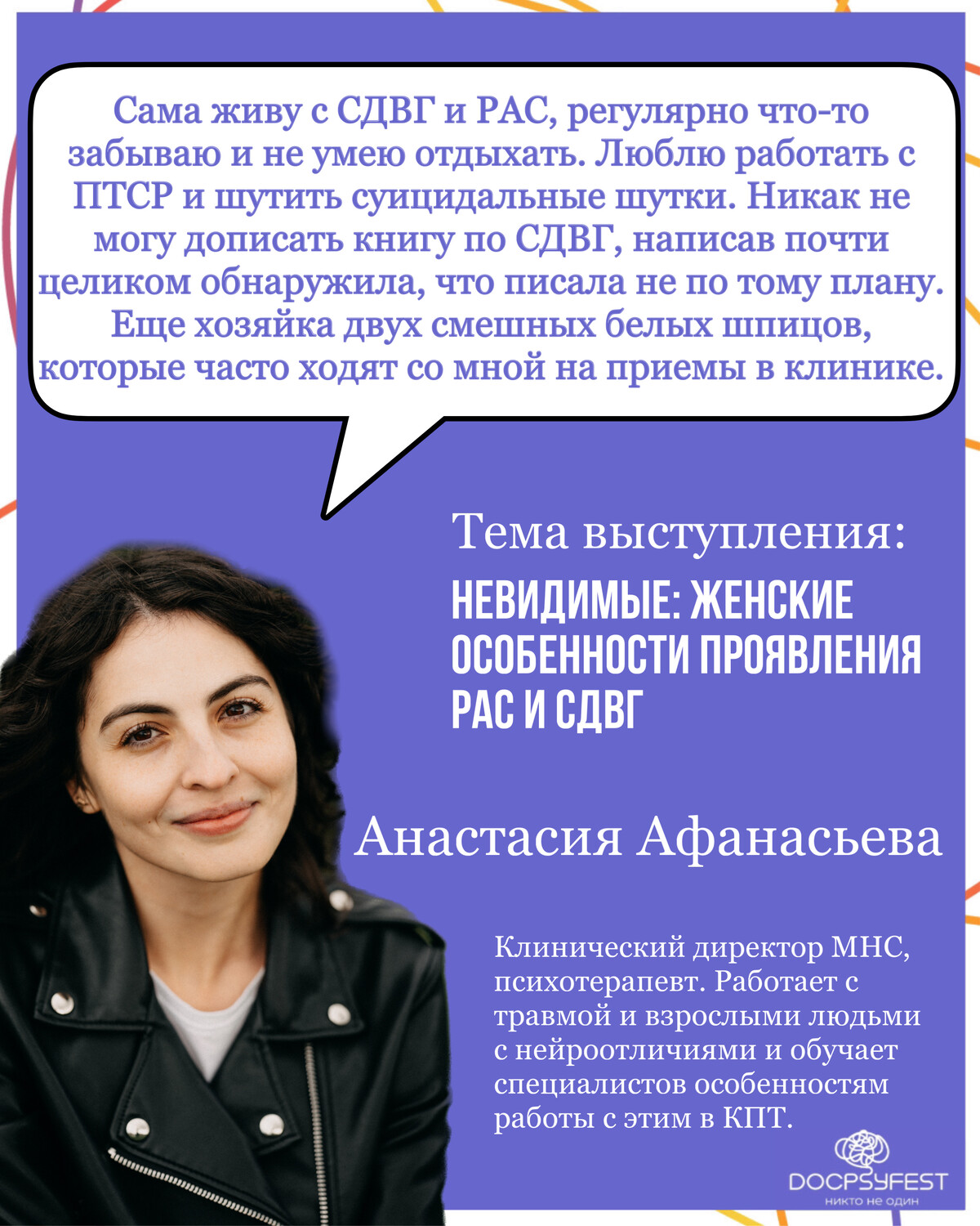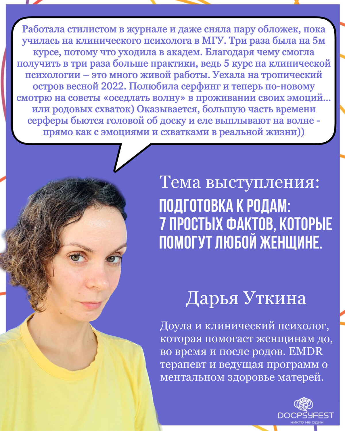 | 18 ноября (сб) | Дарья Уткина Тема: Подготовка к родам: 7 простых фактов, которые помогут любой женщине. | Ирина Ушкова Тема: Пищевое поведение и образ тела у подростков - как предотвратить развитие РПП? | Анастасия Афанасьева Тема: Невидимые: женские особенности проявления РАС и СДВГ | Татьяна Смирнова Тема: Сострадание как важный навык в период жизненной турбулентности | Ксения Белова Тема: Секс в долгосрочных отношениях | Мария Кокова Тема: Что мы (не) знаем о горевании |