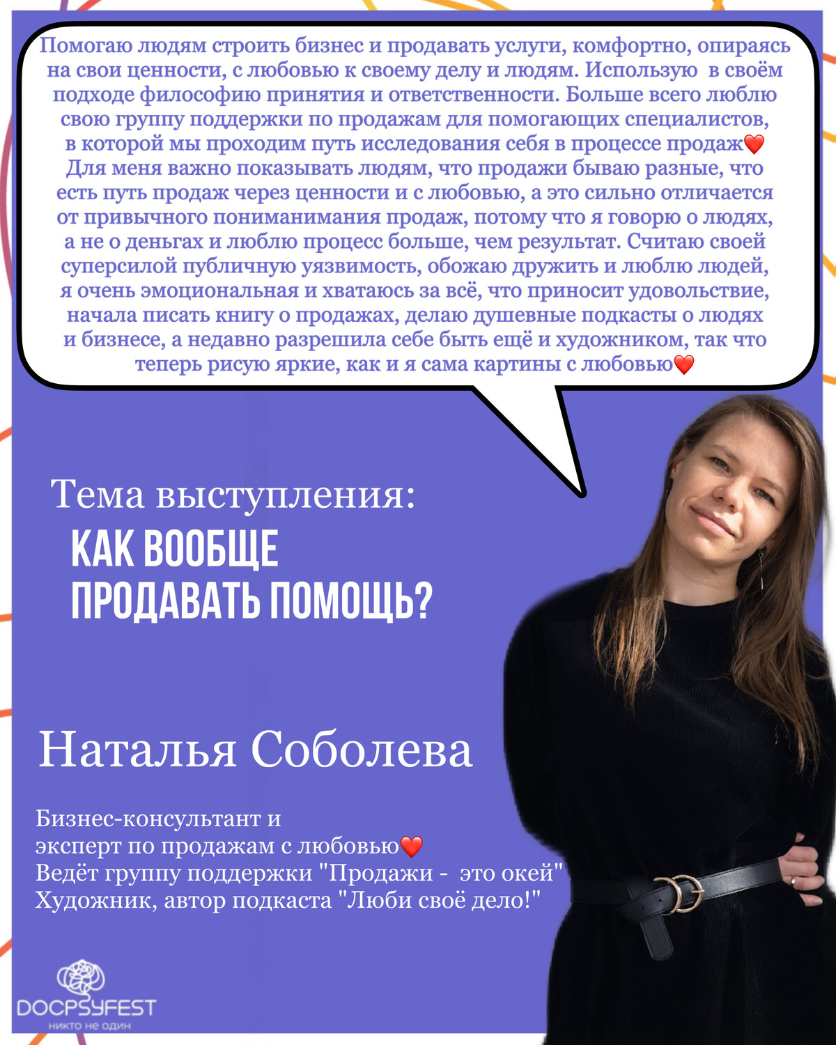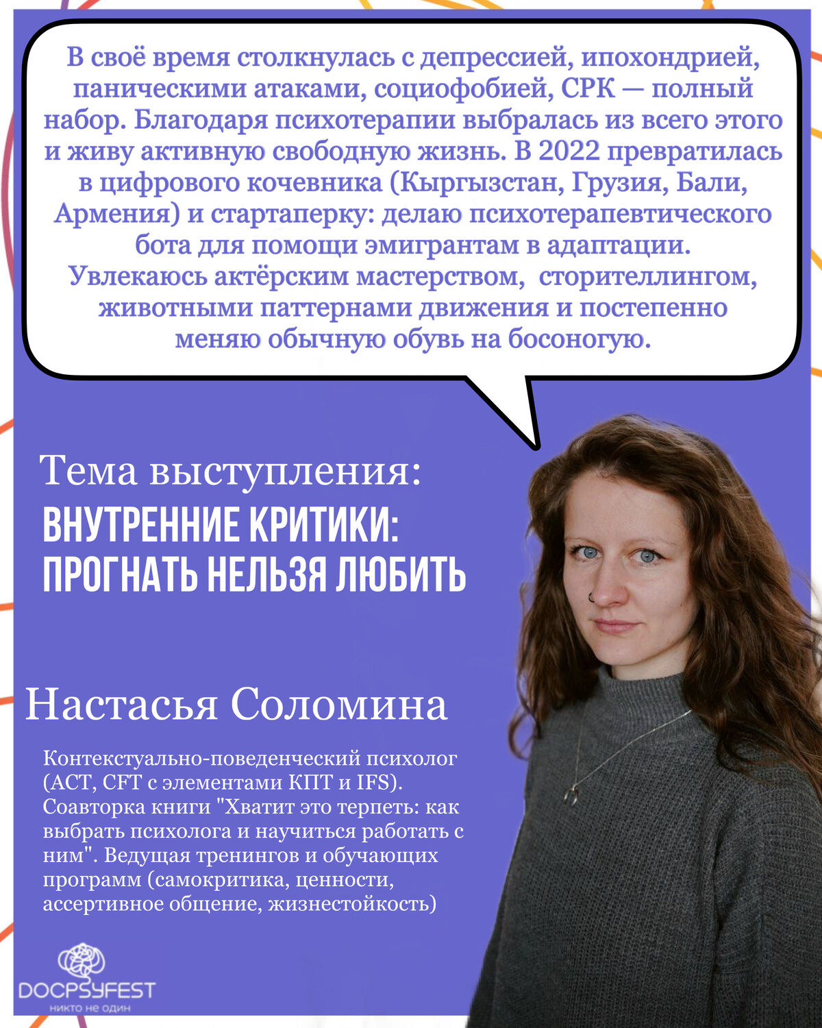 Ключевая идея нашего фестиваля: НИКТО НЕ ОДИН. С чем бы вы ни столкнулись, будь то проблемы в отношениях с другими и с собой, психические расстройства, насилие, потери и кризисы, вы не одни. Есть люди, которые проходят путь, похожий на ваш, и есть люди, которые с этим работают, опираясь на мировые стандарты, вкладывая в это море сочувствия, тысячи часов практики и много любви к профессии и людям