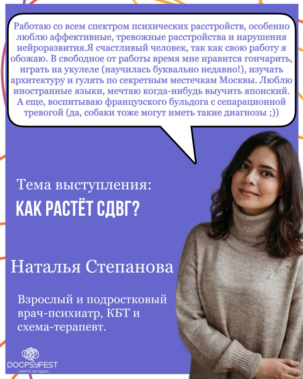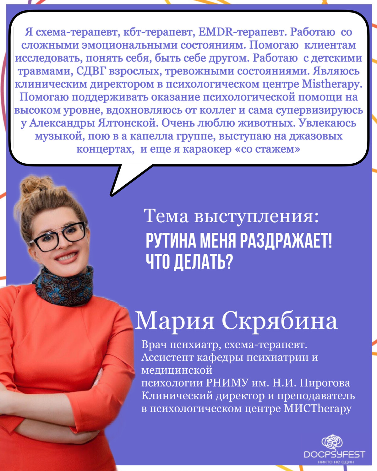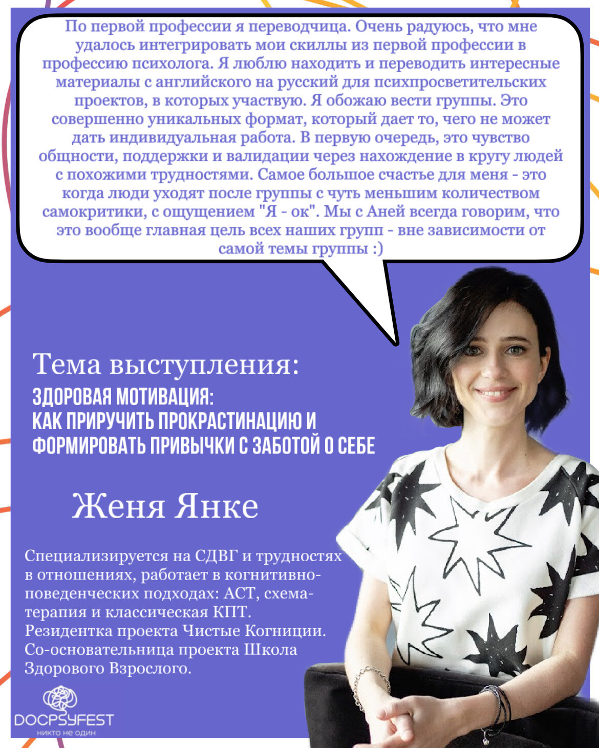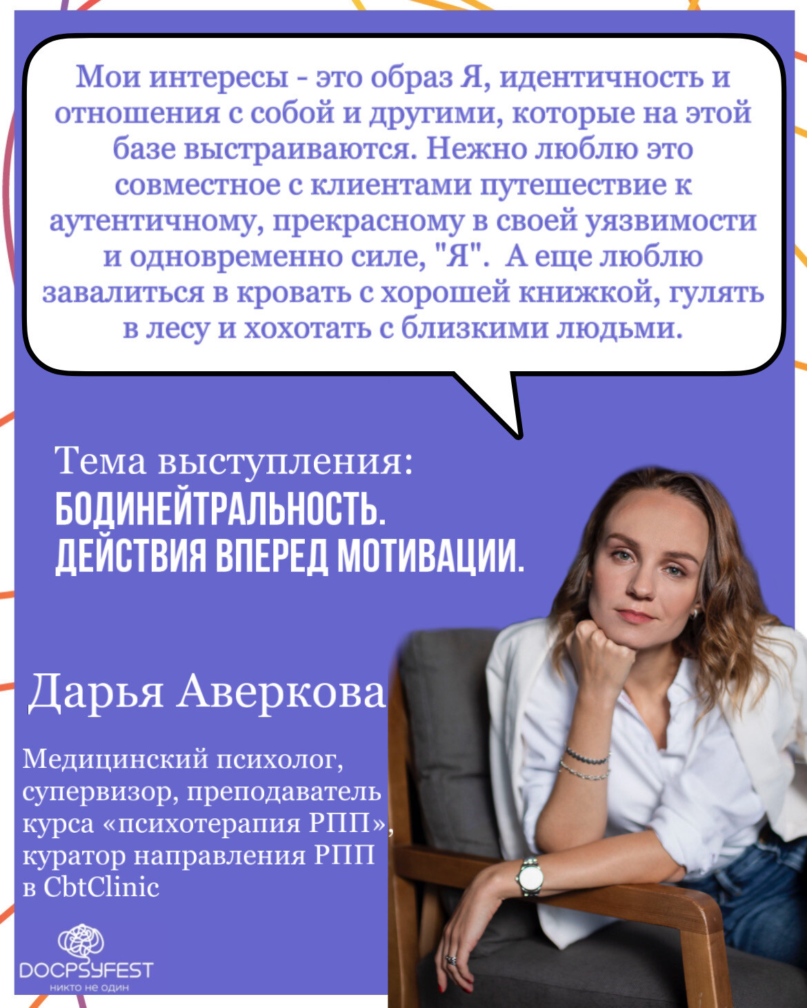 | 15 ноября (ср) | Дарья Аверкова Тема: Бодинейтральность. Действия вперед мотивации. | Марина Гармаш Тема: DMDD. Расстройство дисрегуляции настроения у детей. | Татьяна Павлова Тема: Неопределённость - почему мы её боимся? И как её полюбить. | Евгений Шабалин Тема: Все что вы хотели знать о социофобии, но боялись спросить | Наталья Степанова Тема: Как растет СДВГ? | Женя Янке Тема: Здоровая мотивация: Как приручить прокрастинацию и формировать привычки с заботой о себе |